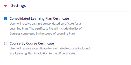 - Consolidated Learning Plan Certificate: User will receive a single consolidated certificate for a Learning Plan. The certificate file will include the list of Courses completed in the scope of the Learning Plan.