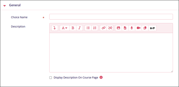 General Name Description. Choice Name* Enter a Choice Name. Description Provide a suitable description of the choice. Display description on the course page Enable the checkbox to view the choice description on the course page.