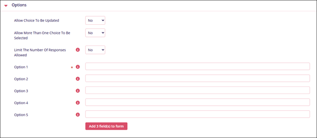 Options Name Description. Allow Choice to be Updated Select either Yes or No Allow more than one choice to be selected Select either Yes or No Limit the number of responses allowed Select either Yes or No Option 1* Specify the options for participants