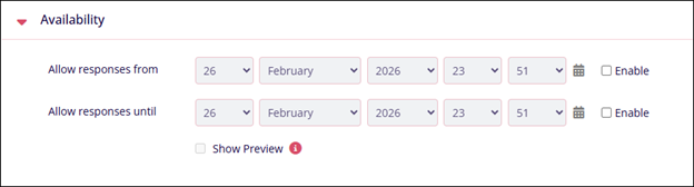 Availability Name Description. Allow responses from Enable or disable the setting by clicking on the checkbox. Specify a particular date and time if enabled. Allow responses until Enable or disable the setting by clicking on the checkbox. Specify a particular date and time if enabled.