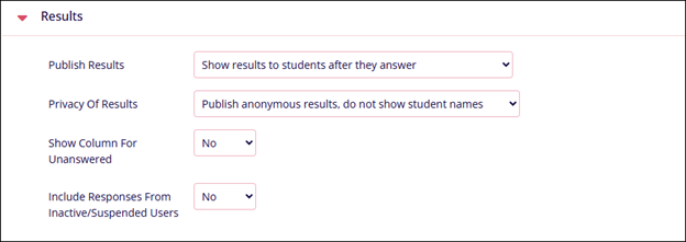 Show column for unanswered Select either Yes or No Include responses from inactive/suspended users Select either Yes or No