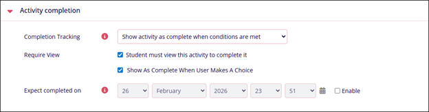 Note: Visible only if ‘Show activity as complete when conditions are met’ is enabled in Completion Tracking.Expect completed on