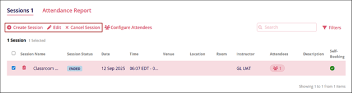 - To Edit the session, select the session by clicking on the checkbox and click on the Edit option.