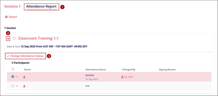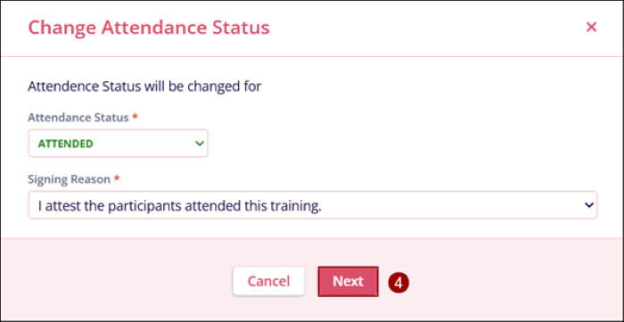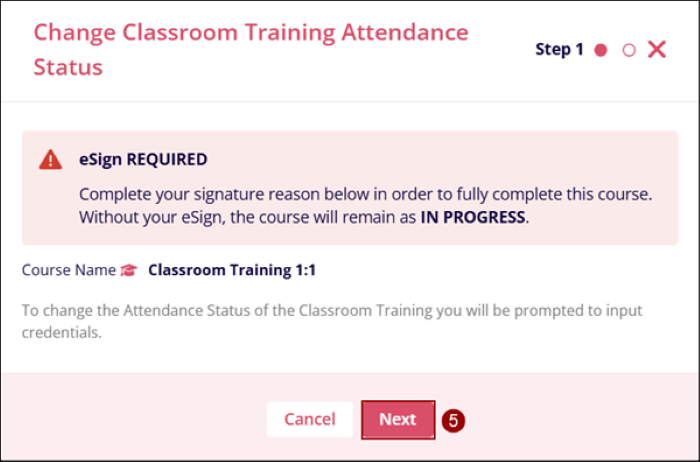 - The Change Classroom Training Attendance screen, displays the success and eSign required