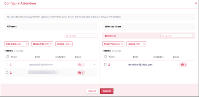 - On the Configure Attendees screen, add attendees from the list of users enrolled in this