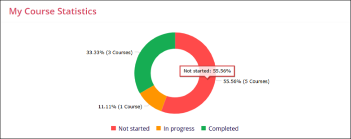 The My Course Statistics dashlet displays a donut that indicates the distribution of courses assigned to a learner, categorized as Not Started, In Progress, and Completed. Additionally, the dashlet displays the numerical values alongside percentage indicators on the course completion status donut chart.