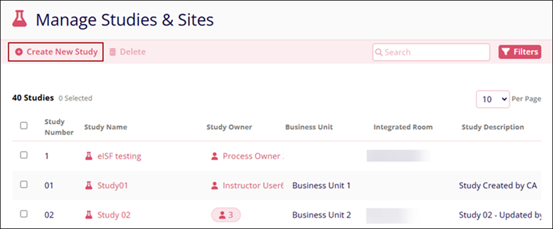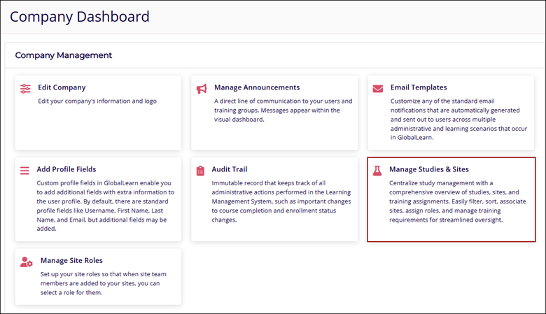 - Navigate to the Company Dashboard page and select the Manage Studies & Sites