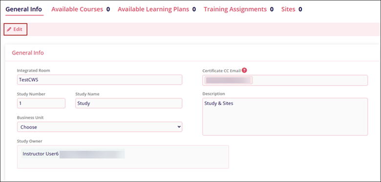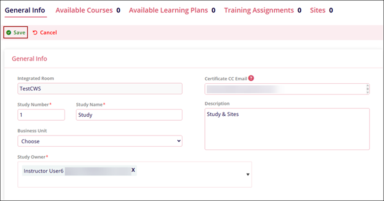 - Certificate CC Email: Enter email addresses of recipients who should also receive the study-related course completion certificate along with the learner.