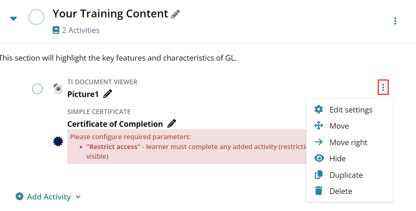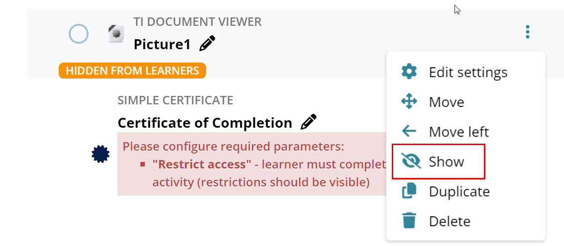 - Click on Hide to keep the activity or resource hidden from the learners.