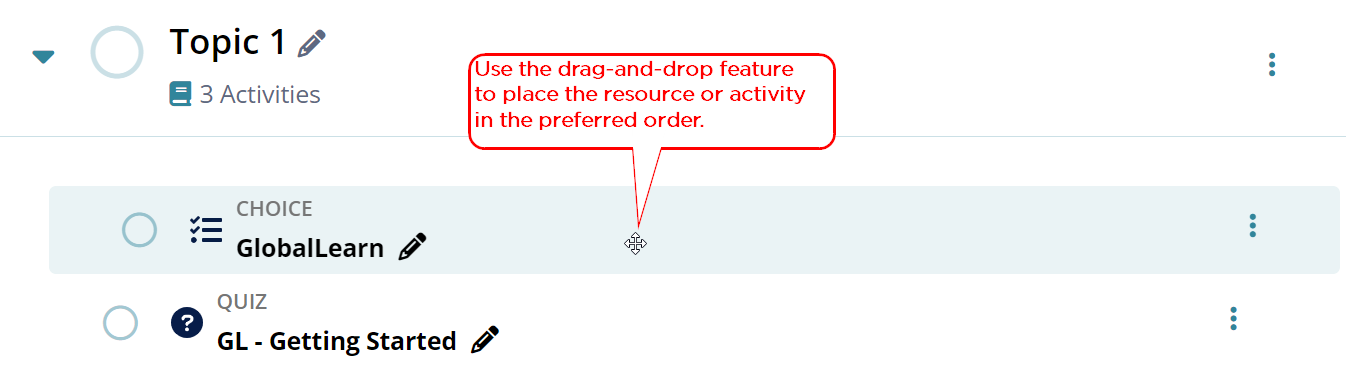- Furthermore, use the drag-and-drop feature to place the resource or activity in the