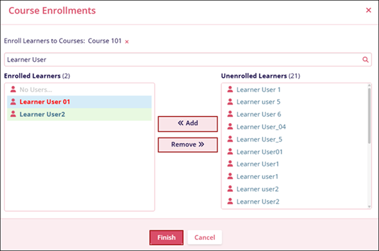 - Select a user from the Enrolled Learners section and click on the Remove >> button.