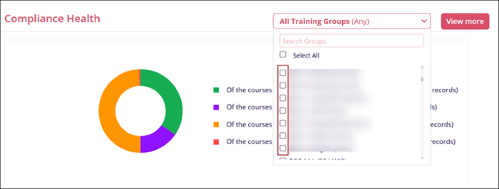 The Compliance Health dashlet can be filtered by Training Groups.
