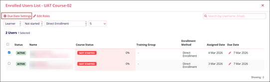 - If the course is created with a Max Date or Max Days, the Enrolled Users List pop-up displays the Due Date Settings button.