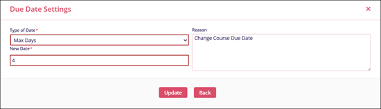 The training window or due date may sometimes need to be extended for learners enrolled in courses created with a Max Date or Max Days. For such courses with max date or days, learners are required to complete the course within the defined timeline.