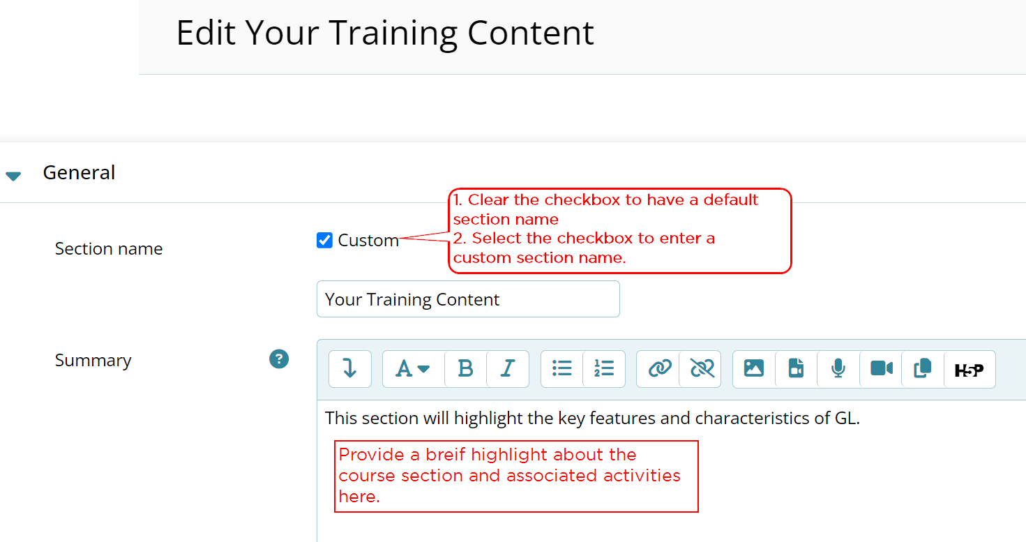 - Optionally enter a brief text describing the section so that learners can get a highlight of the course content and activities.
