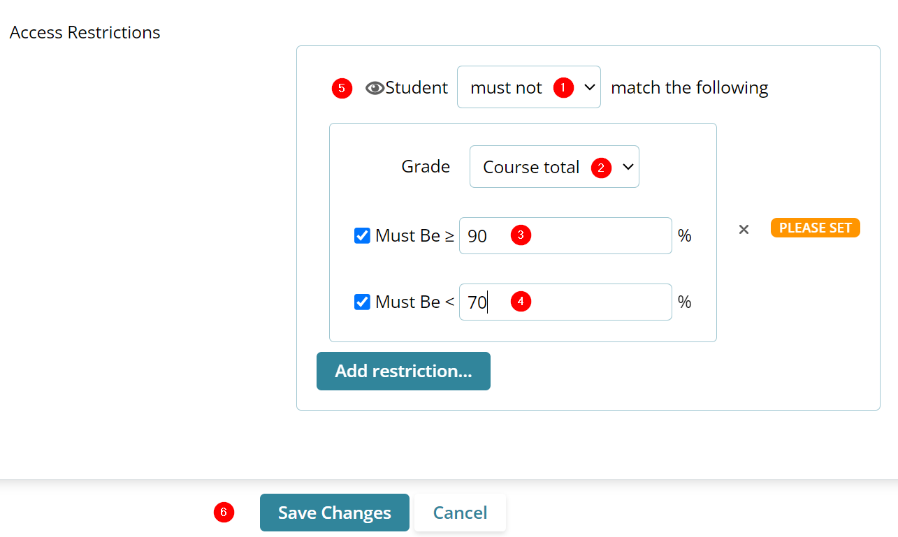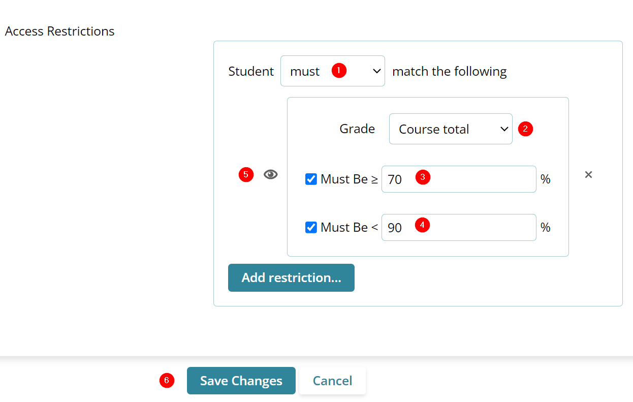 - Click on the view (eye) icon to control the course availability restriction message display.