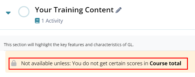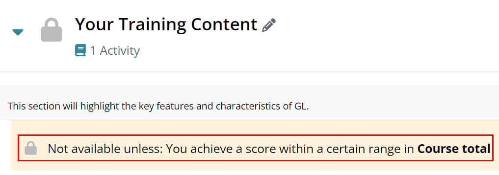 Result: A message will be displayed in the course section, informing learners that they must achieve a specific score for the section to become available.