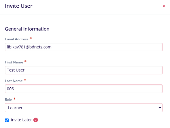 With the ‘Invite Later’ option, administrators can create user profiles and configure training assignments in ‘staging mode’ with controlled invitation release, allowing systematic user onboarding without premature system access.
