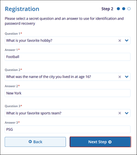 - As a part of step 2, select three secret questions and their corresponding answers for
