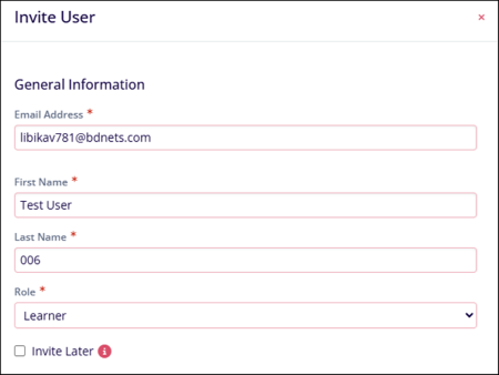 General Settings Field Name Description Email Address* Enter a valid email address First Name Enter the user's first name Last Name Enter the user's last name Role Select either of the following - Learner