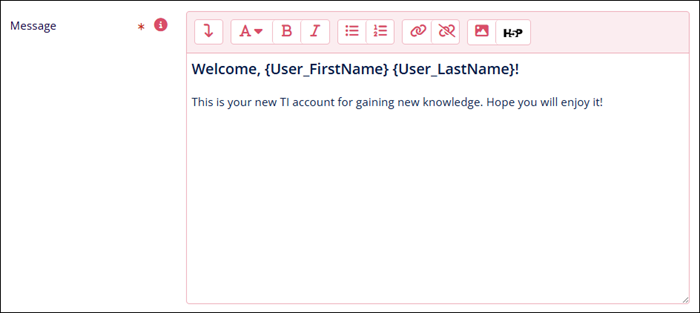 The Manage Welcome Message section enables configuring and customizing a message that will appear to welcome new or existing users, helping to inspire excitement about their learning journey. The Welcome Message is shown to a user after logging in to the system. Depending upon the appearance and frequency of showing.