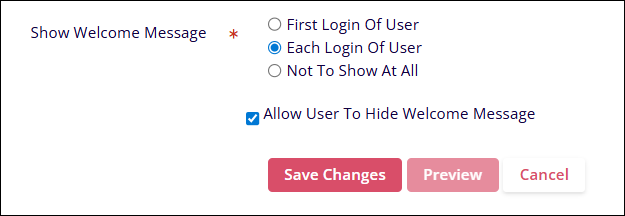 - Within the Show Welcome Message section, select any one of the following options by clicking on the respective radio boxes.