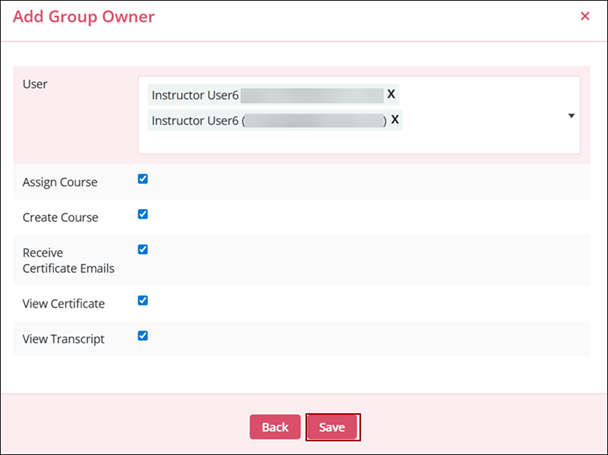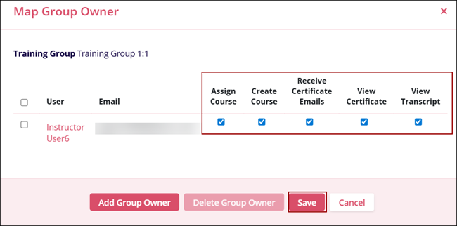 - Keep the Assign Course checkbox checked to enable the group owner to assign courses and vice versa.