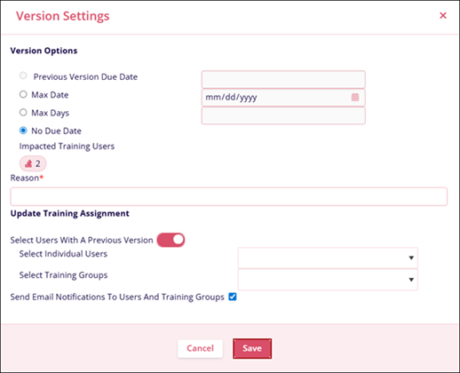 - On the Version Settings screen, provide a mandatory reason for the version change, make