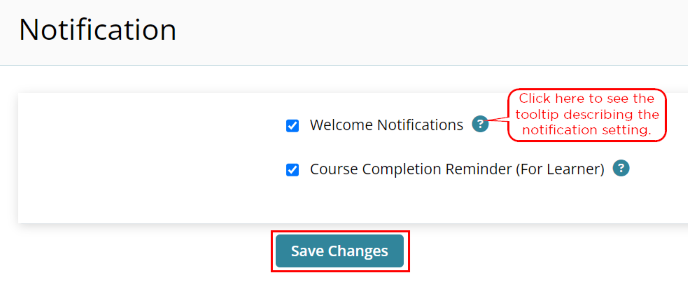 Click on Notification Settings, to access the Notifications page that allows enabling or disabling the welcome notifications and course completion reminders. Click on the checkbox to enable or disable the notification trigger and select Save Changes. Click on the (?) icon to view a tooltip with a description of the particular notification.