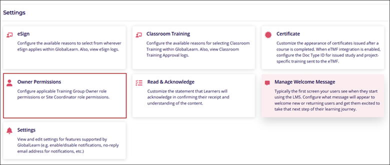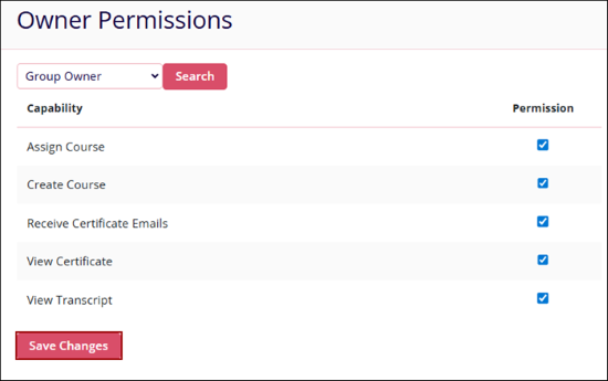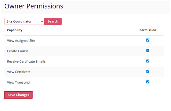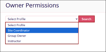 Company Admins can configure Training Group Owner role permissions or Site Co-Ordinator role permissions. Additionally, users can search for an owner and assign required permissions by clicking on the appropriate checkboxes.
