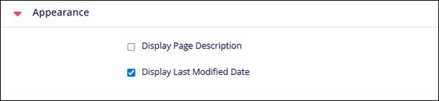 Appearance Name Description. Display page description Enable this setting to enable the page description display. Display last modified date Enable this setting to view the last modified date.