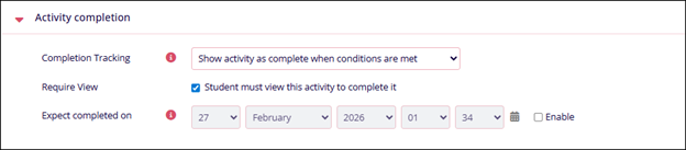 Note: Visible only if Show activity as complete when conditions are met is enabled in Completion Tracking.Expect completed on