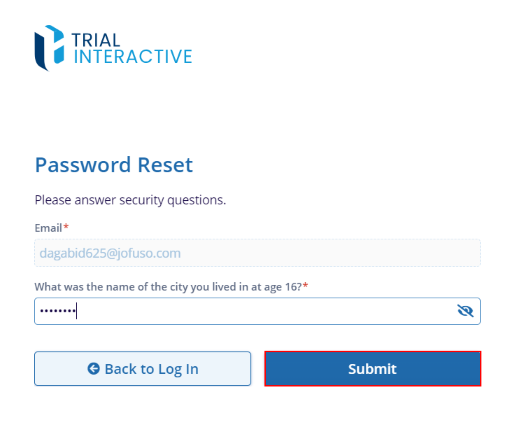 - On the Password Reset screen, enter the answer to the security question and click on