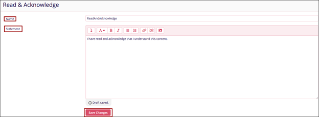 In the Read and Acknowledge section, users can customize the statement that learners must acknowledge to confirm they have received and understood the content.