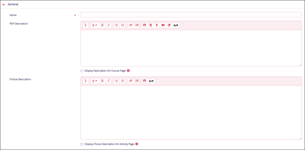 General Name Description. Name* Enter a suitable name for the activity PDF Description Enter the PDF description Choice Description Enter the choice description Display Choice Description on Activity Page Enable the setting to view the descriptions on the Activity page