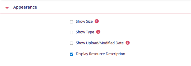 Appearance Name Description. Show Size Check the setting to display the file size. Show Type Check the setting to display the file type. Show Upload/Modified Date Check the settings to display the uploaded or modified date Display Resource Description Check the settings to enable the display of resource descriptions.