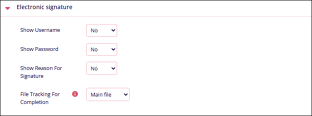 Electronic Signature Name Description. Show User name Select Yes or No Show password Select Yes or No Show reason for signature Select Yes or No File tracking for completion Select either of the following