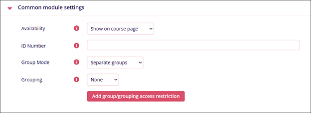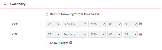Availability Name Description. Restrict Answering to this field Enable this setting to configure the activity’s availability. Open Set the date and time from when the activity should open. Until Set a date and time for when the activity should remain open.