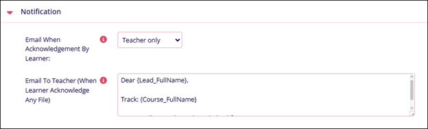 Notification Name Description. Email when acknowledgement by Learner This setting allows teachers to receive an email when learner acknowledges Email to Teacher (when learner acknowledge any file) This setting allows defining a specific message to be sent to the teacher when the learner acknowledges