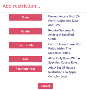 - Add one or multiple restrictions by clicking on the Add restriction button. Refer to the procedure stated in the sections below.