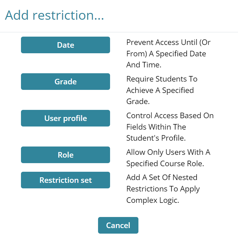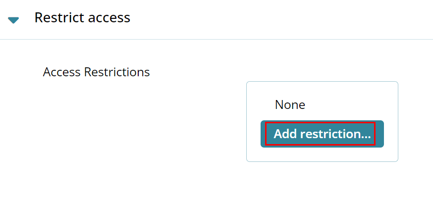 - Add one or multiple restrictions by clicking on the Add restriction button. Refer to the procedure stated in the Date, Grade, User Profile, Role, and Restriction Set sections below.