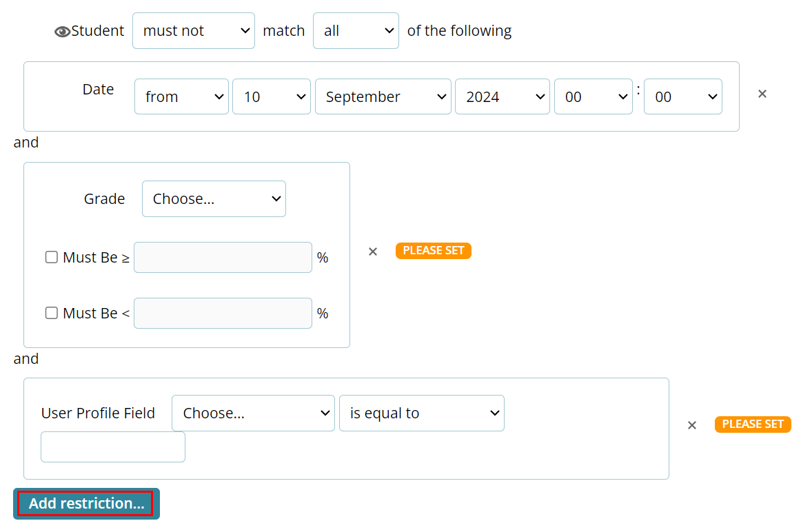 To add a restriction set, click on the Add restriction… button and select the required restriction criteria.