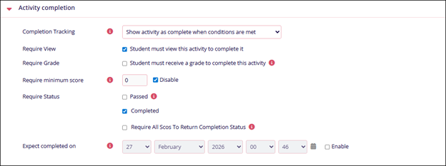 Note: This option becomes visible when the ‘Show Activity as complete when conditions are met’ option is selected in Completion trackingRequire Minimum Score Uncheck the Disable checkbox and enter a score that will be a minimum requirement to pass this activity. Require Status Check or uncheck all options or either of the following