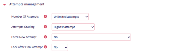 Attempt management Name Description Number Of Attempts Select either Unlimited attempts or the number of attempts up to six. Attempts Grading Select either of the following