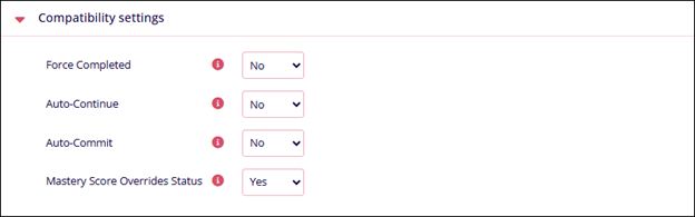 Compatibility settings Name Description Force Complete Select either Yes or No Auto-Continue Select either Yes or No Auto-Commit Select either Yes or No Mastery score overrides status Select either Yes or No