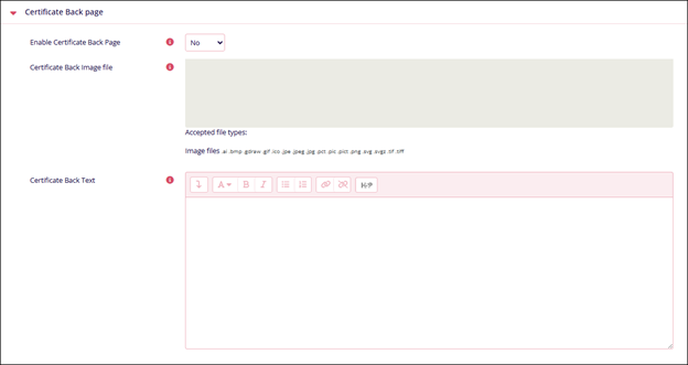 Certificate Back page Name Description Enable Certificate Back Page Select either Yes or No Certificate Back File image Drag and drop or upload files in the specified file formats into the designated area.