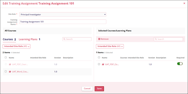 - Removal of Site Personnel Role: The system identifies all active training assignments linked to the role, providing options to either keep users enrolled in ongoing training or unenroll them. A confirmation warning displays impacted courses and learning plans, ensuring administrators can make informed decisions.