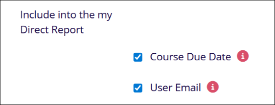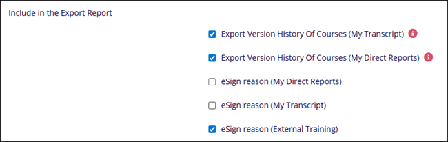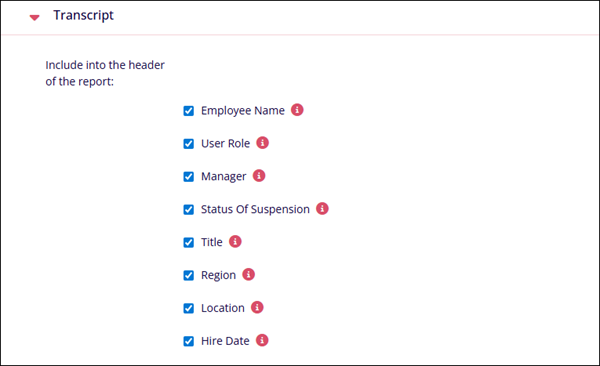 The Transcript settings allow selecting the specific details to include in the report of a user's training logs or the training logs of their direct reportees.