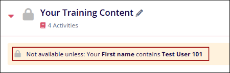 Result: The course section will display a message stating that the course won’t be available for users unless the test word is in their first name.