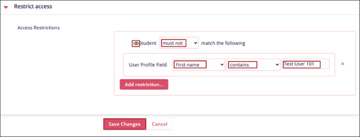 Result: The course section will display a message stating that the course will be unavailable to users whose name does not contain the word ‘test user 101’. This means all users not having the words ‘test user 101’ in their first name can access this course.